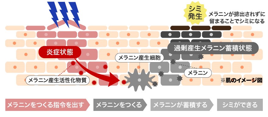 ニキビによって引き起こされた炎症でメラノサイトが刺激され、シミのもととなるメラニンが分泌。