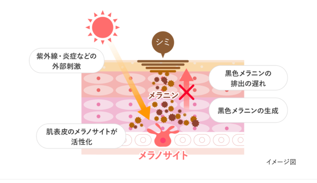 ターンオーバーが乱れてしまうと、本来排出されるはずのメラニンが排出されず蓄積してシミにつながります。
