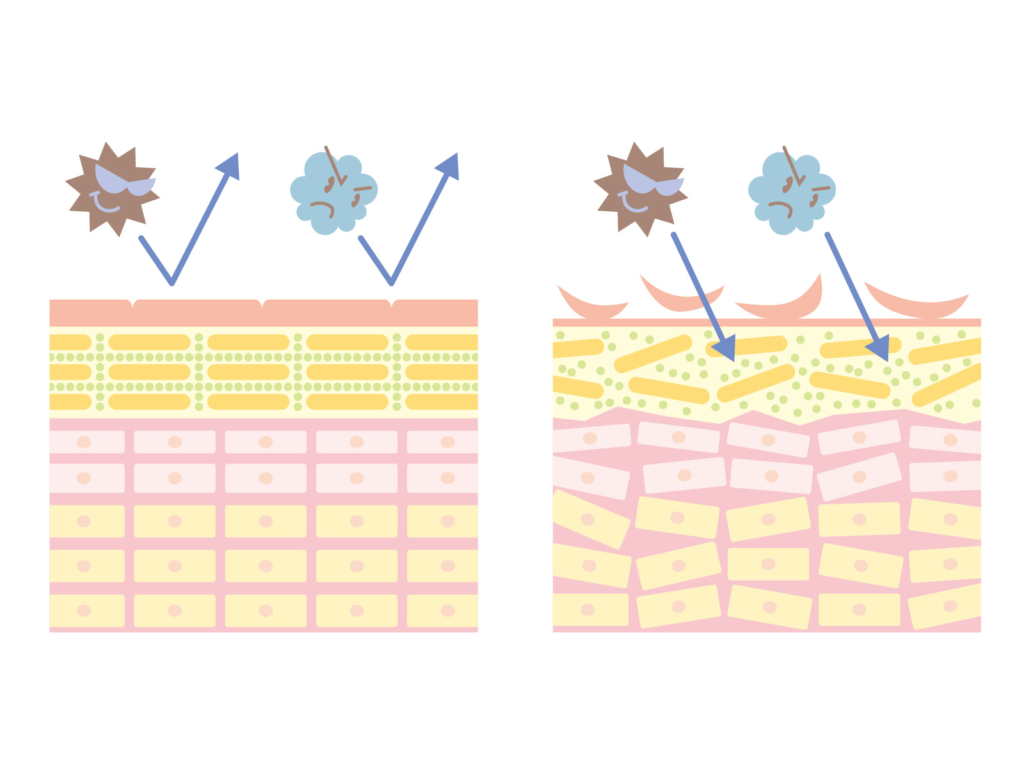 左のようにバリア機能が正常だと、紫外線や外部刺激の影響を受けにくく、